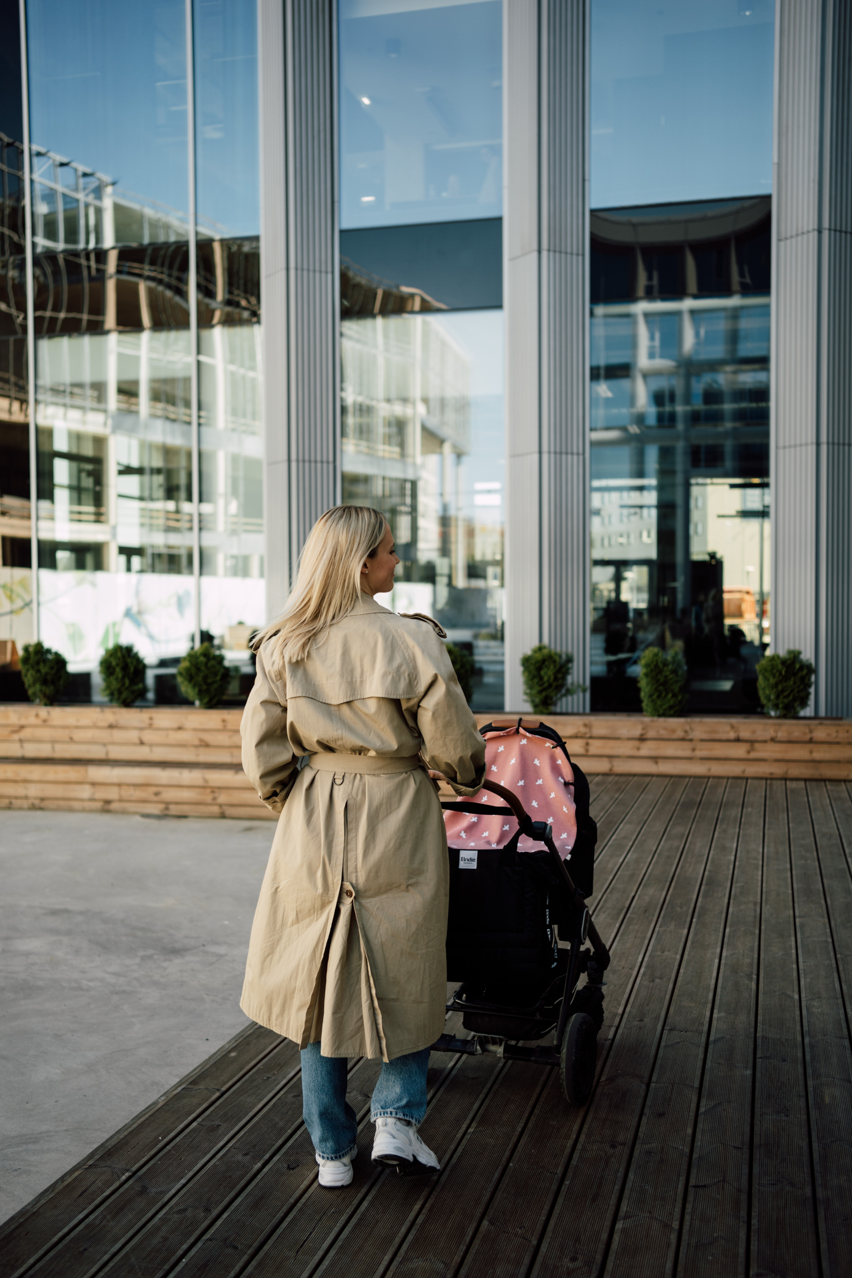 - Vaunuverhoon kuuluu 5 mustaa rengasta, joilla saat verhon kiinni vaunuihin