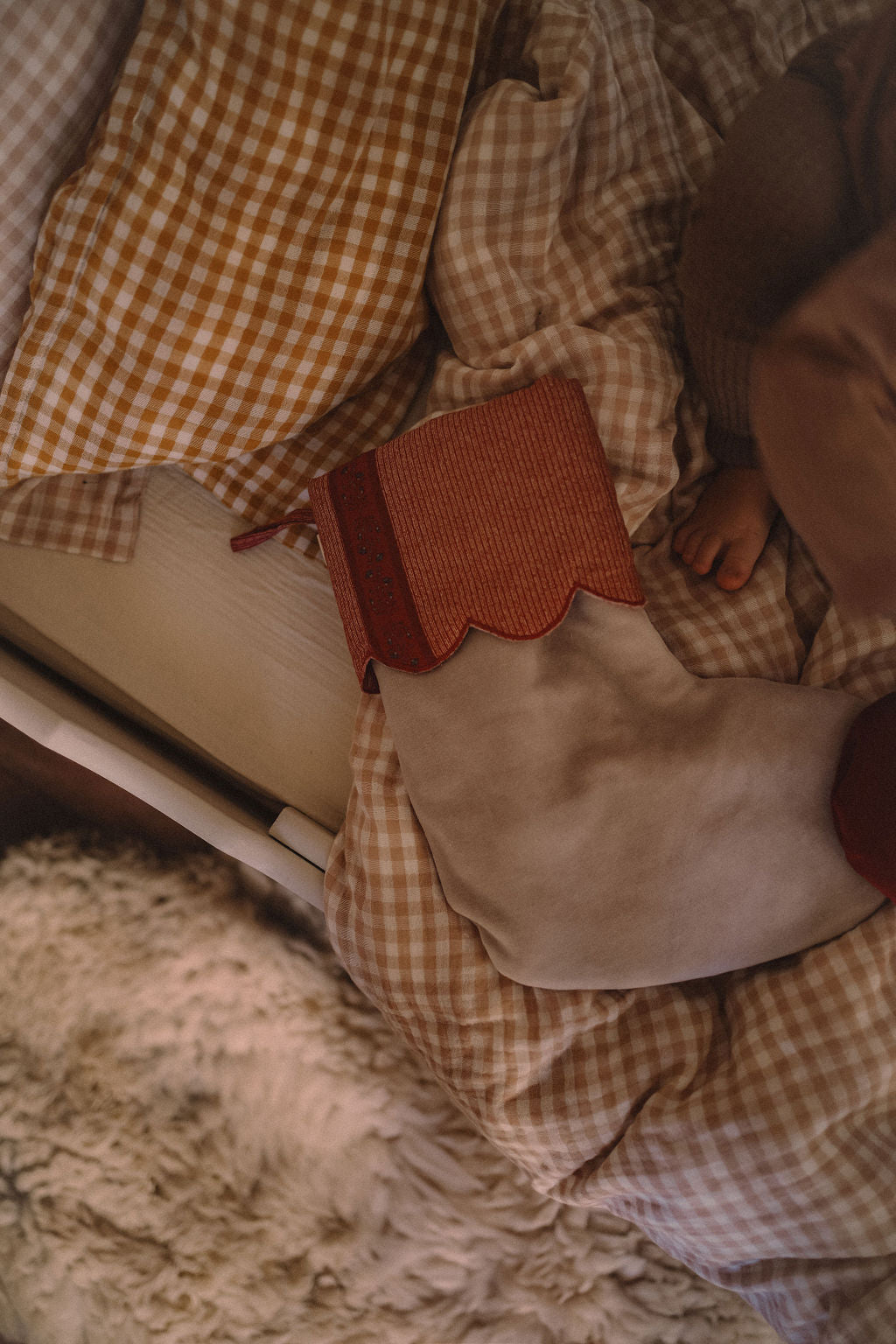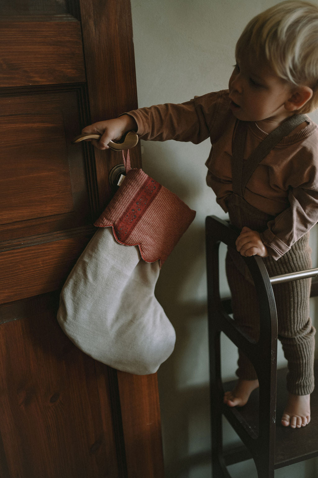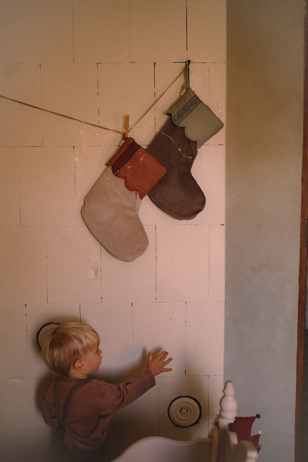Jokainen TISU:n joulusukka valmistetaan pehmeästä sametista ja laadukkaasta japanilaisesta puuvillasta. Tukevan ripustuslenkin ansiosta sukka on helppo kiinnittää juuri oikealle paikalle.