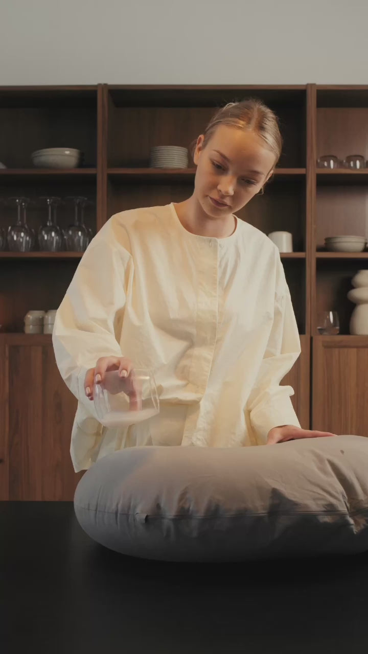 Päivittäiseen puhdistukseen riittää, että pyyhit tyynyn pinnan puhtaalla, kostealla liinalla. Tarvittaessa tyynyn voi pestä viileän juoksevan veden alla käyttäen mietoa pesuainetta. Kuivaa pyyhkeellä pesun jälkeen.