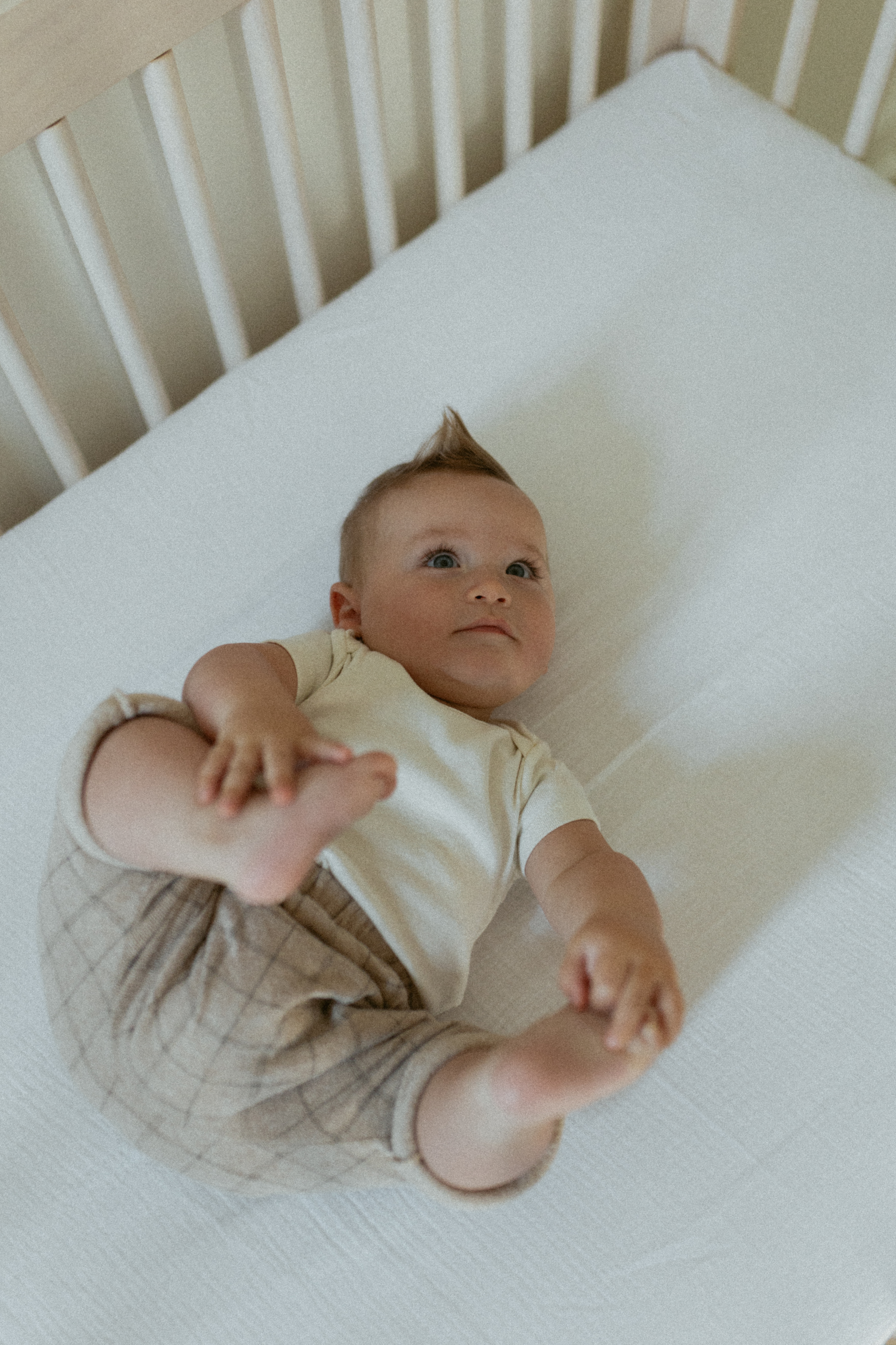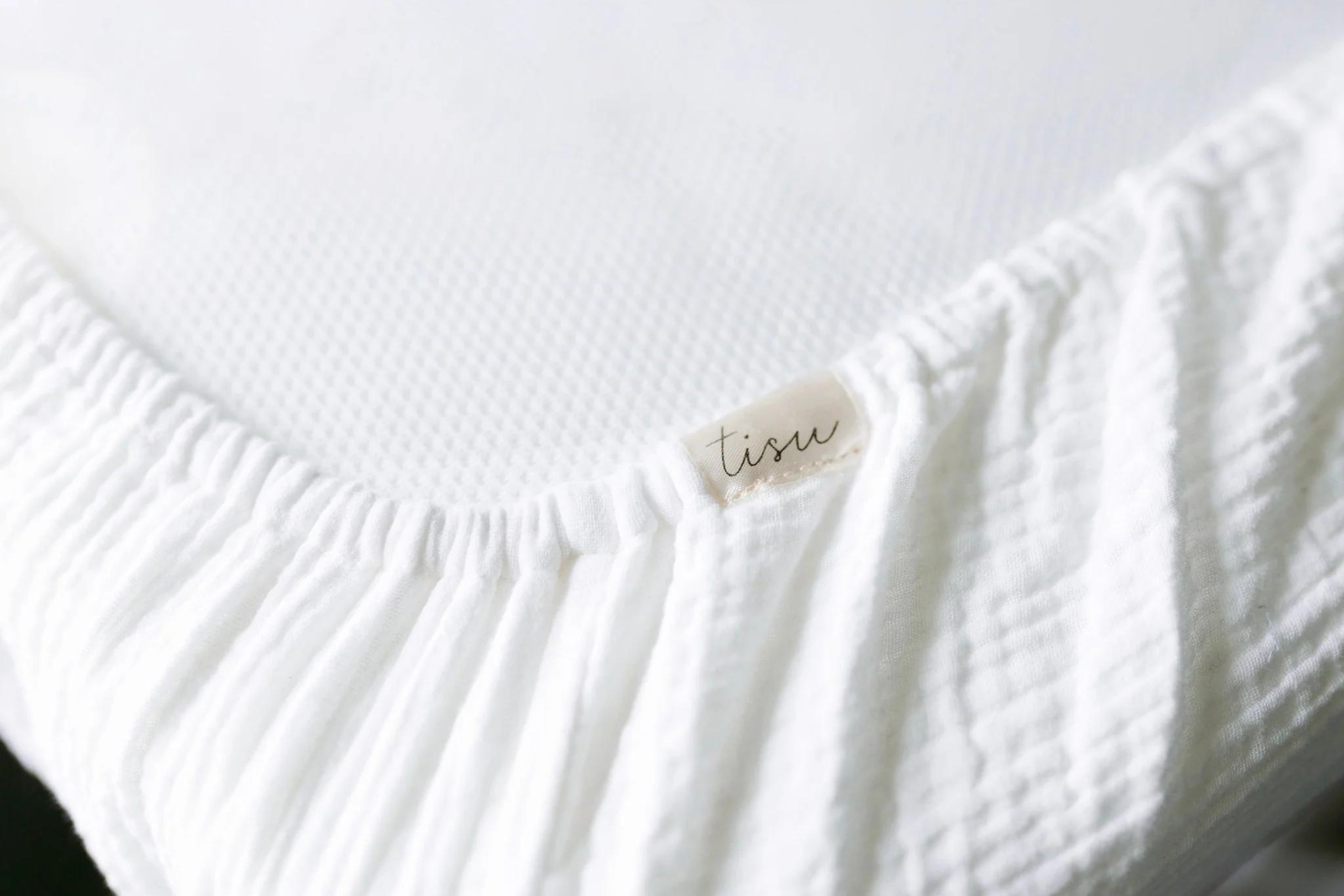 TISU -aluslakanat ovat valmistettu superpehmeästä GOTS -sertifioidusta orgaanisesta musliinikankaasta, joka ei vaadi silitystä! Kuminauha pitää lakanan paikallaan, vaikka vauva kääntyilisikin.