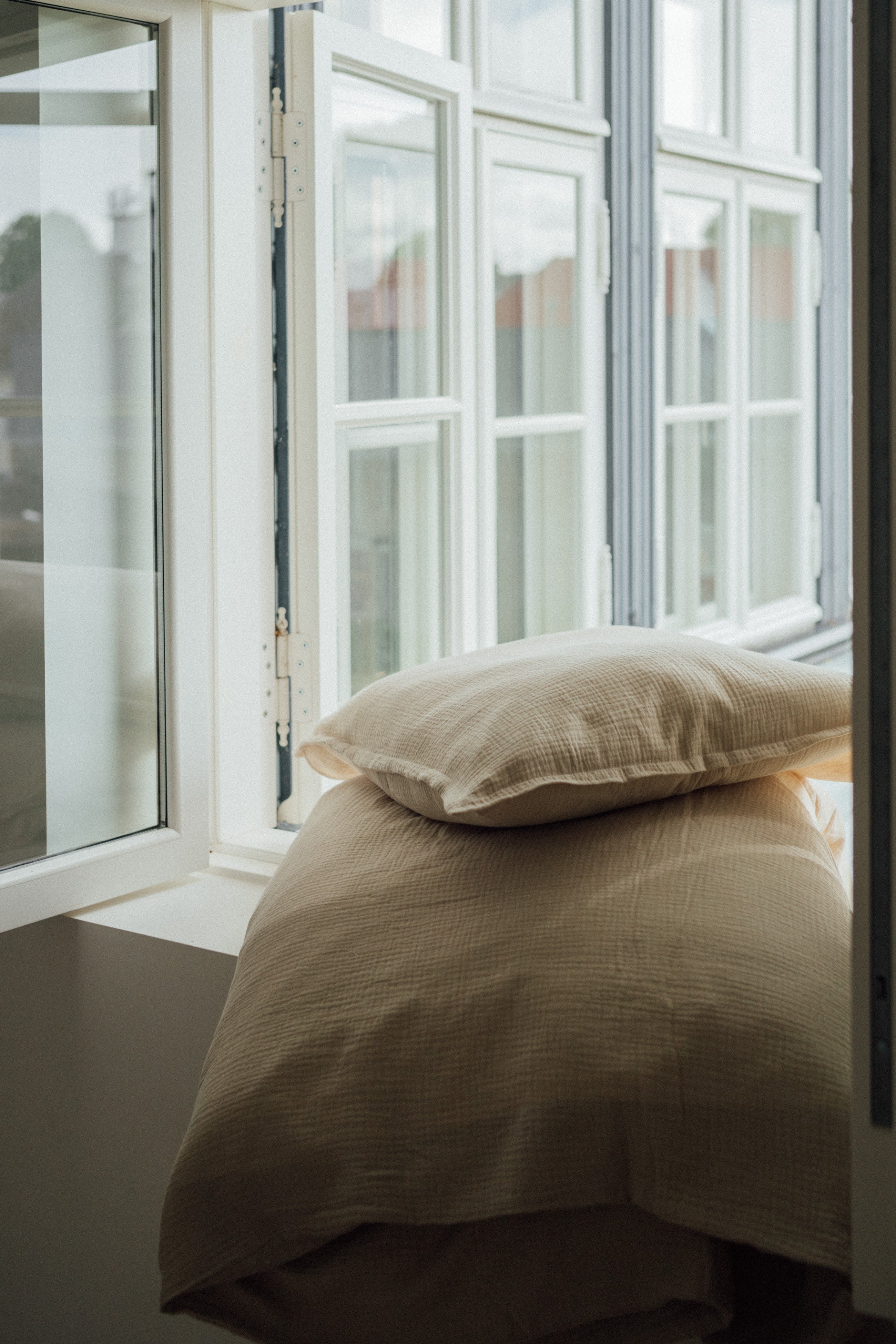 Musliinikangas on paitsi kaunis ja ajaton, myös erittäin kestävä – se säilyttää pehmeytensä ja raikkaan ilmeensä toistuvissakin pesuissa. Lakanat voidaan pestä 40 °C tai 60 °C asteessa saman sävyisten tekstiilien kanssa ja kuivata kuivausrummussa.