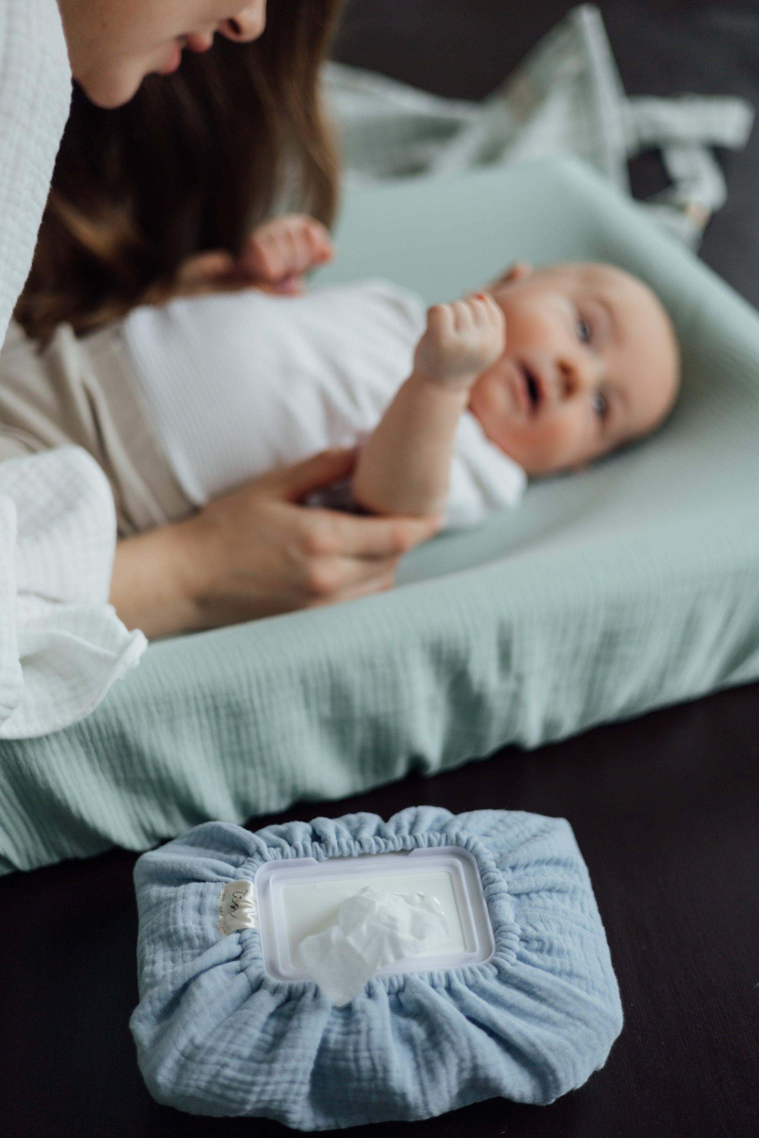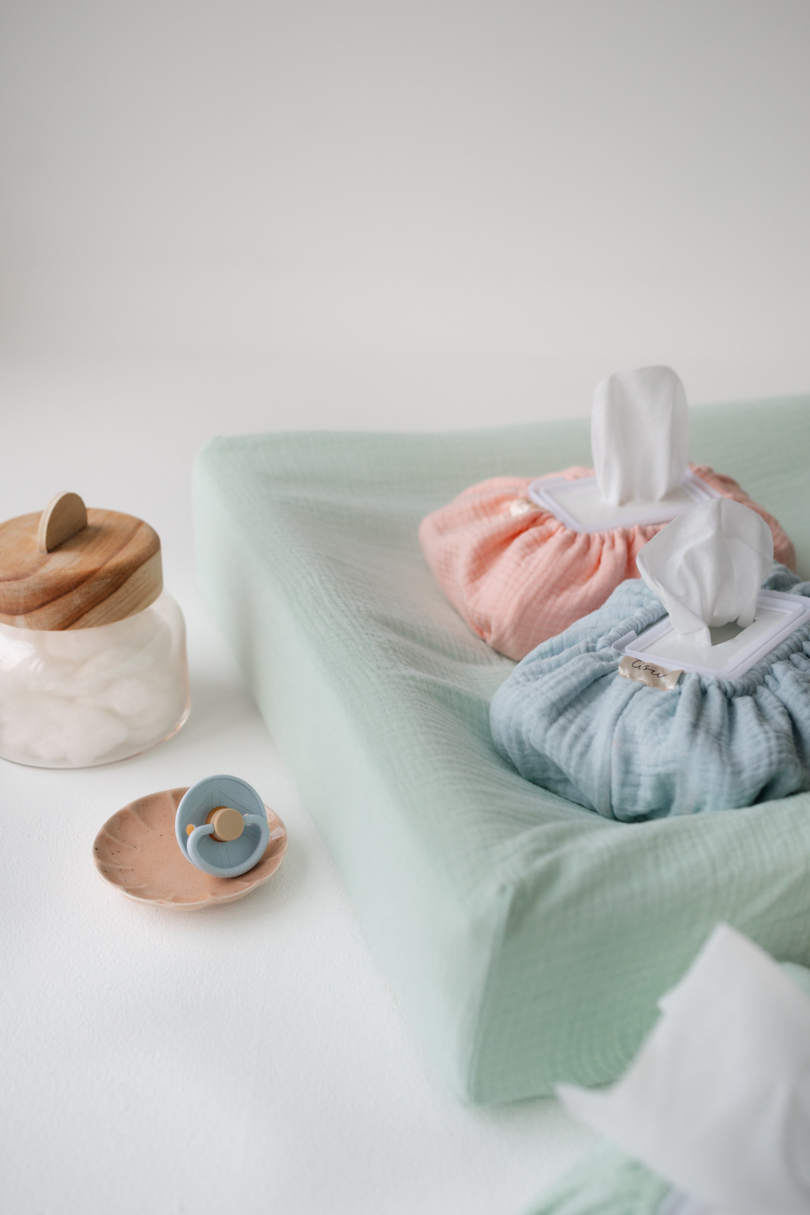 Superkauniit kosteuspyyhepakettien päälliset ovat Valmistettu samasta pehmeästä musliinista ja samoissa kauniissa väreissä kuin TISUn hoitoalustan päälliset. Yhdessä ne luovat ihanan viimeistellyn ja tyylikkään yksityiskohdan vauvan hoitopisteelle! 🌸