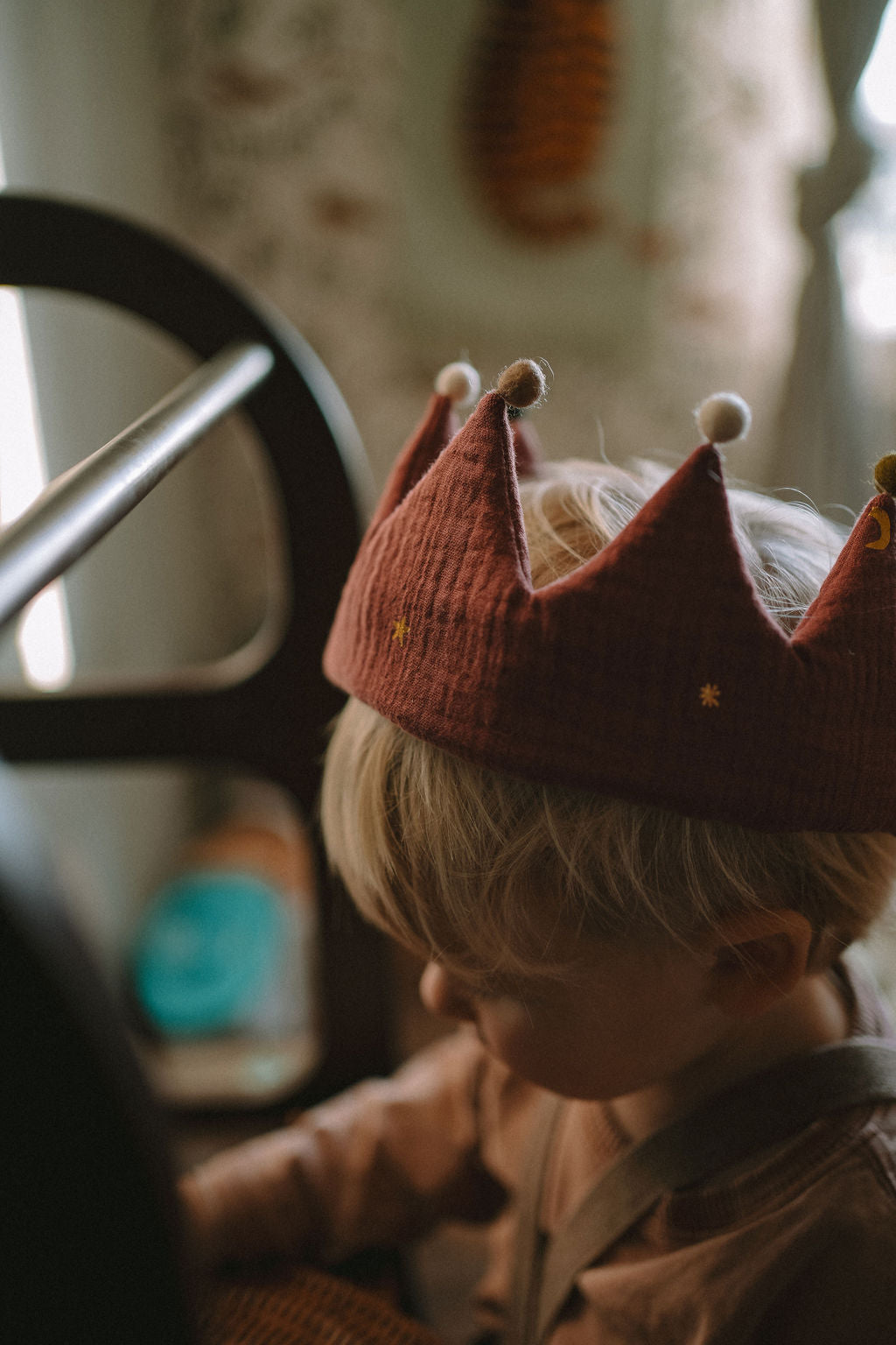 TISU:n kaunis ja kevyt musliinikankaasta valmistettu kruunu on täydellinen prinsessalle tai prinssille, juhlaan tai arkeen.