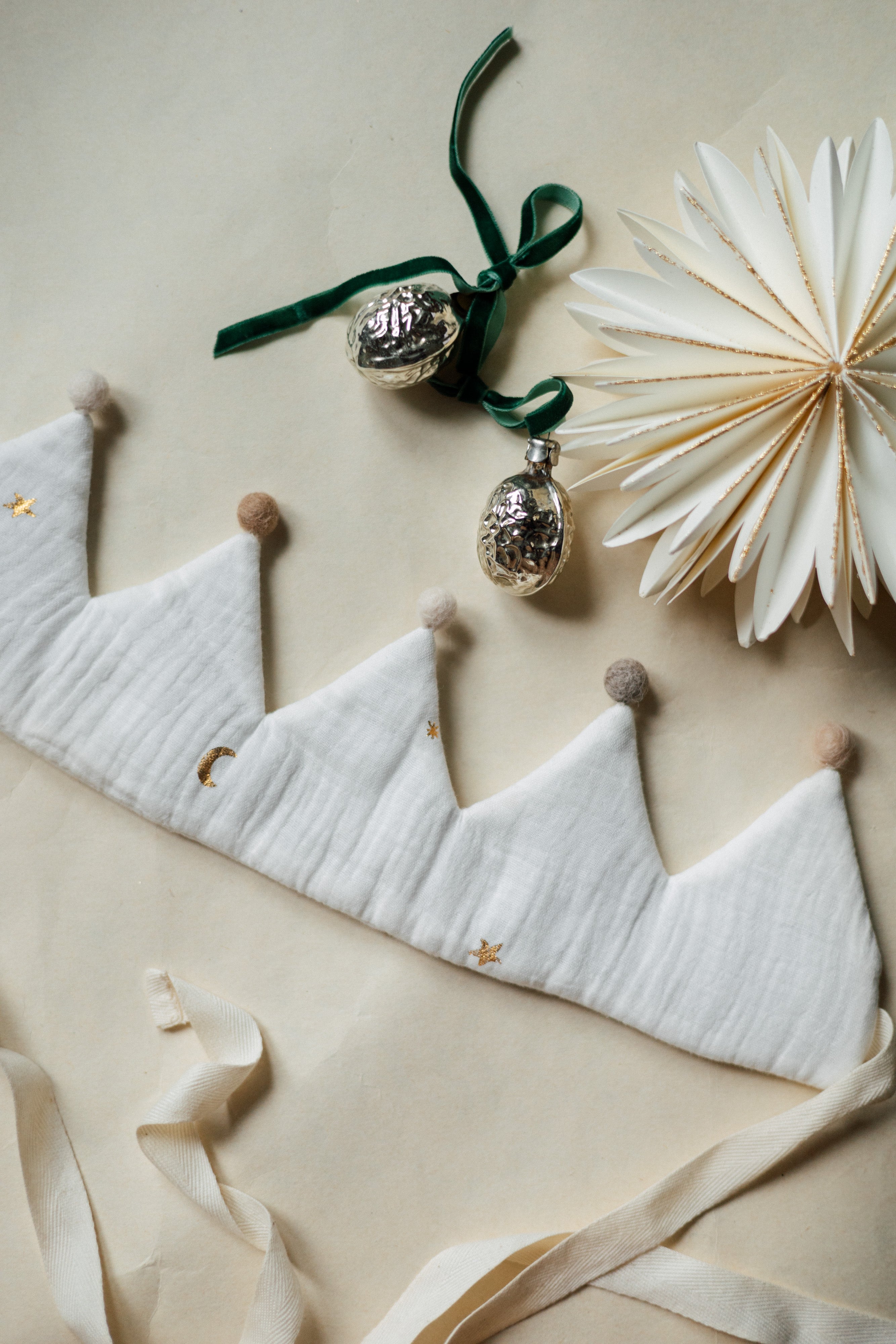 TISU:n kaunis ja kevyt musliinikankaasta valmistettu kruunu on täydellinen prinsessalle tai prinssille, juhlaan tai arkeen.
