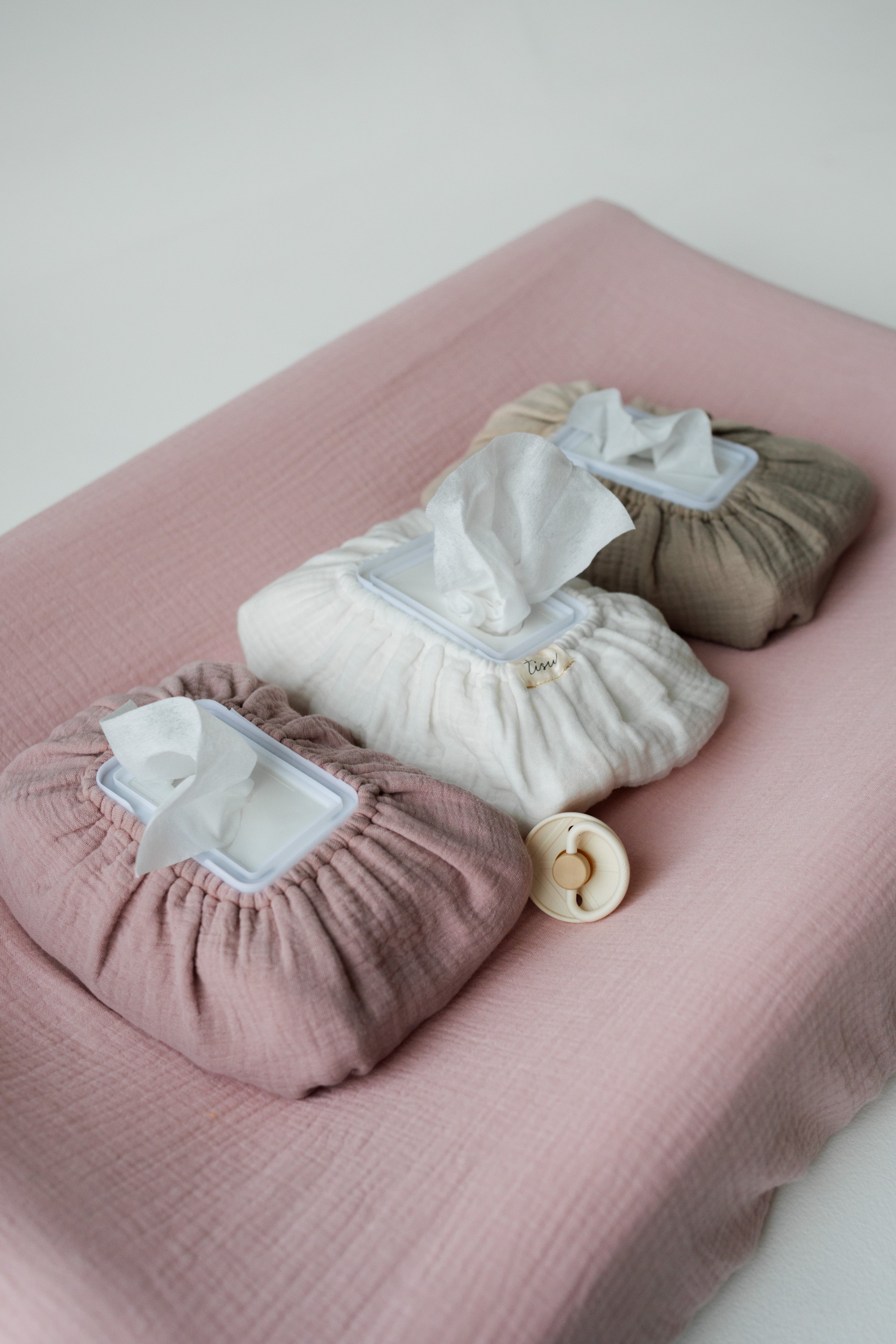 TISU:lta on saatavilla superkauniit päälliset kosteuspyyhepaketeille. 🌼 Ne on valmistettu samasta materiaalista ja samoilla väreillä kuin TISU:n hoitoalustan päälliset. Tyylikkäät yhdessä - näin saat ihanan viimeistellyn yksityiskohdan vauvan hoitopisteelle!