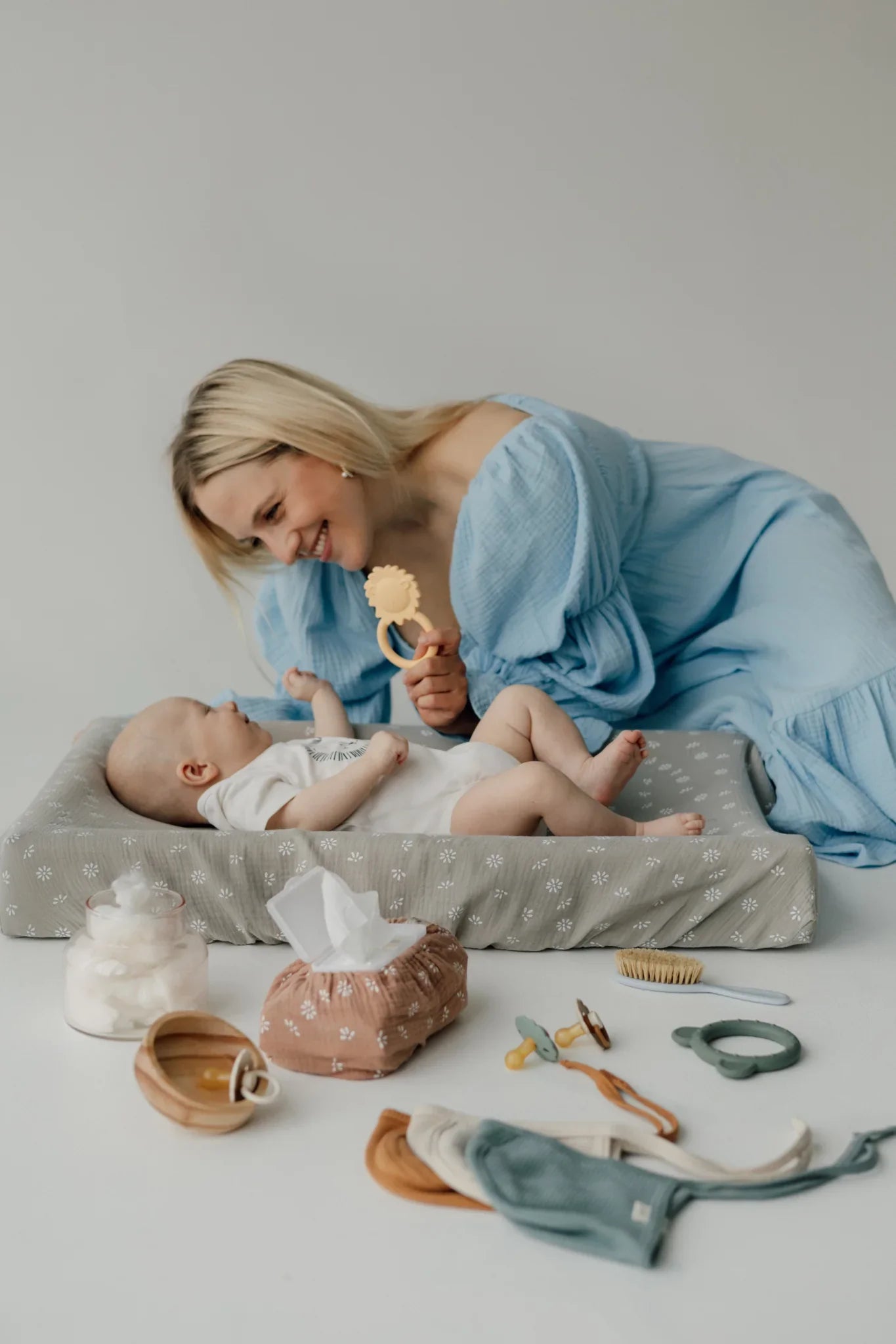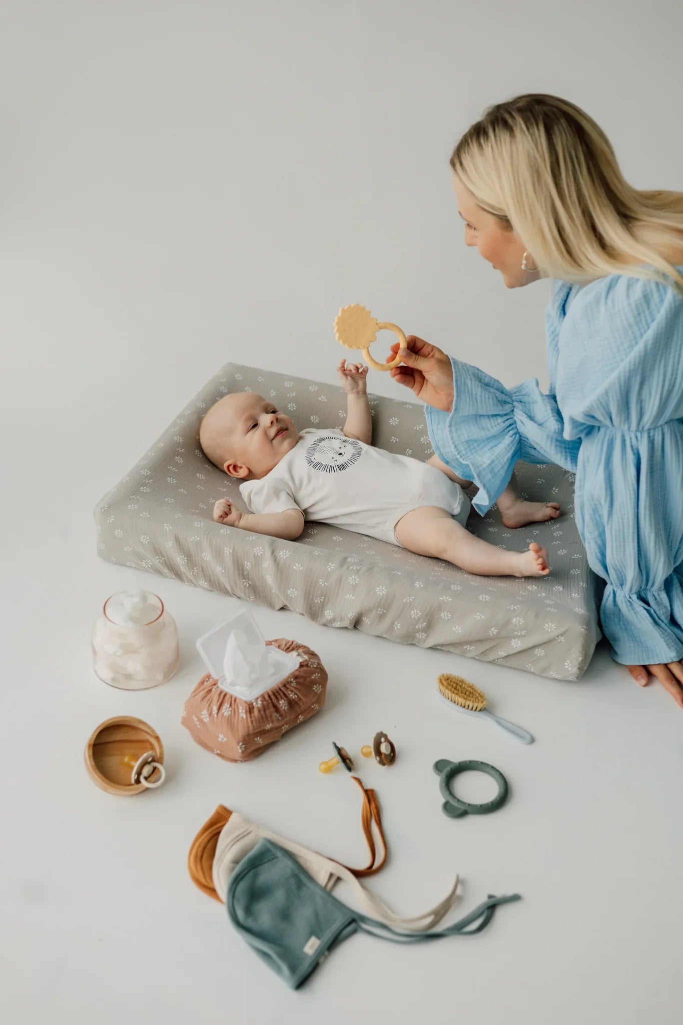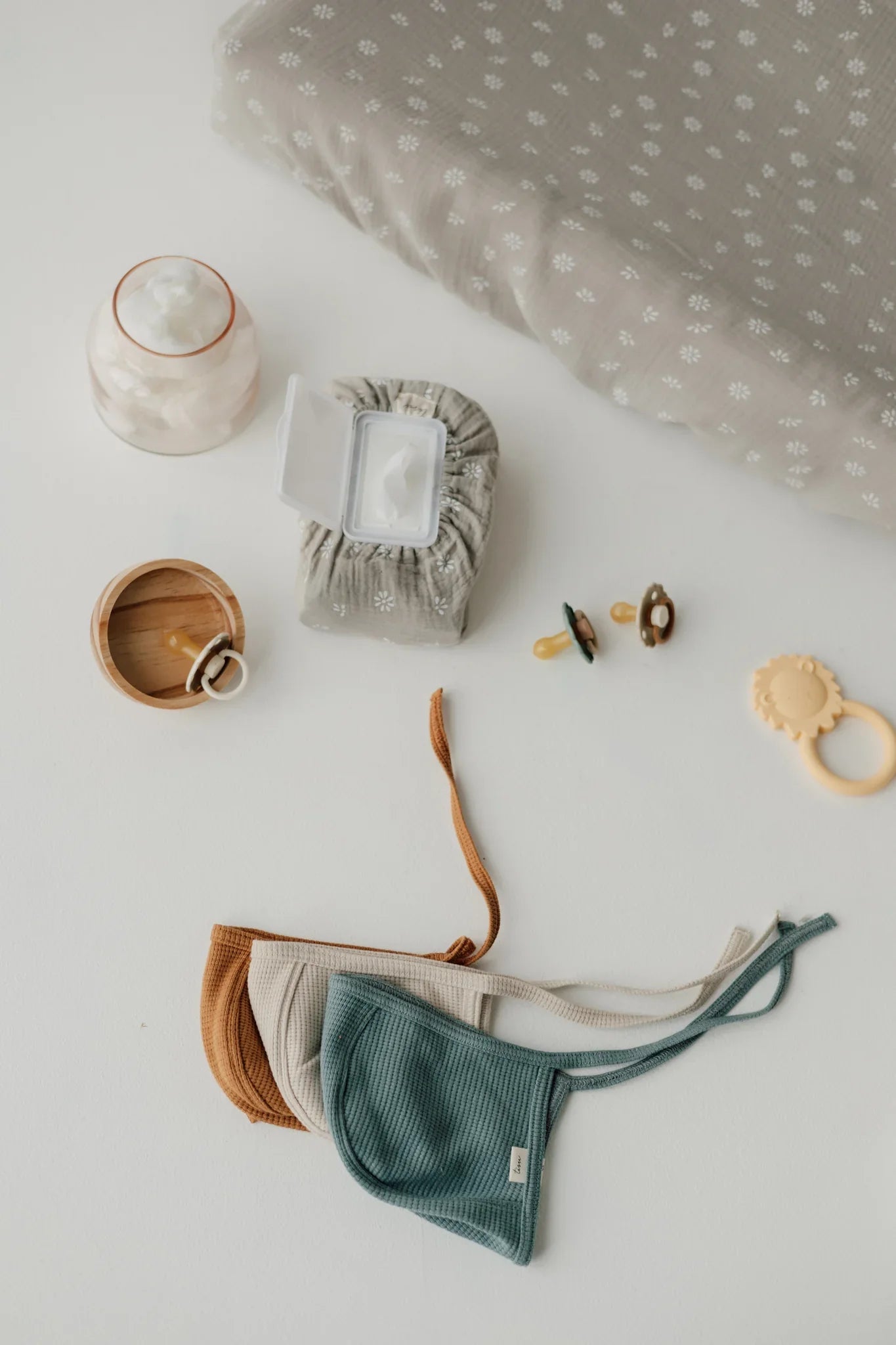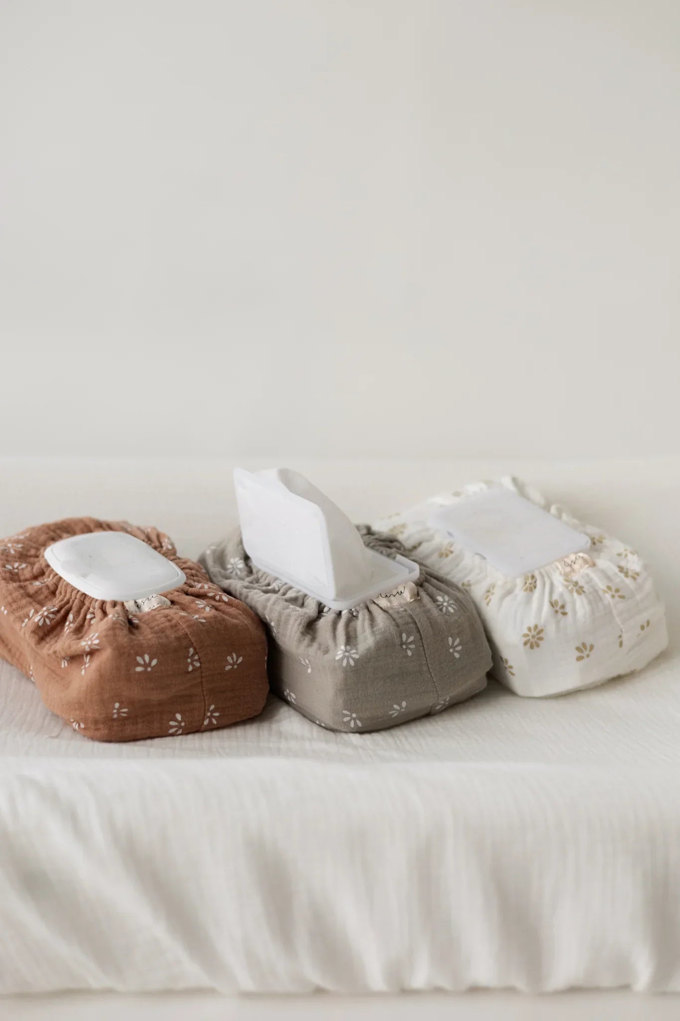 Superkauniit kosteuspyyhepakettien päälliset ovat Valmistettu samasta pehmeästä musliinista ja samoissa kauniissa väreissä kuin TISUn hoitoalustan päälliset. Yhdessä ne luovat ihanan viimeistellyn ja tyylikkään yksityiskohdan vauvan hoitopisteelle! 🌼